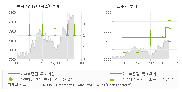 교보증권의 동종목에 대한 최근 1년동안의 투자의견은 전체적으로 큰 변화없이 유지되고 있다. 목표주가는 2016년9월 8,000원이 저점으로 제시된 이후 이번에 발표된 9,200원까지 꾸준하게 상향조정되어 왔다.