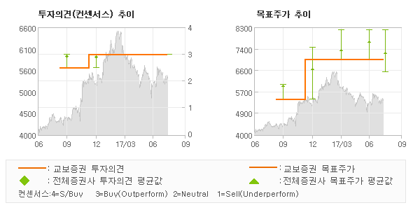 교보증권의 동종목에 대한 최근 1년동안의 투자의견은 전체적으로 큰 변화없이 유지되고 있다. 목표주가는 2016년9월 5,400원이 저점으로 제시된 이후 이번에 발표된 7,000원까지 꾸준하게 상향조정되어 왔다.