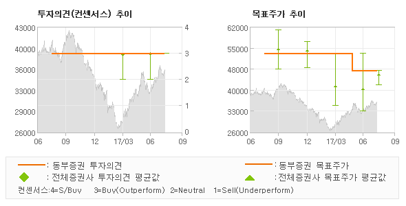 동부증권의 동종목에 대한 최근 1년동안의 투자의견은 전체적으로 큰 변화없이 유지되고 있다. 목표주가는 2016년8월 53,000원까지 높아졌다가 2017년5월 47,000원을 최저점으로 목표가가 제시된 이후 최근에도 47,000원으로 제시되고 있다.