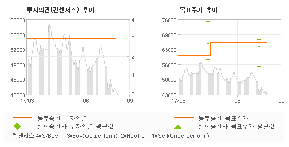 동부증권의 동종목에 대한 최근 3개월 동안의 투자의견은 전체적으로 큰 변화없이 유지되고 있다. 목표주가는 2017년4월 60,000원이 저점으로 제시된 이후 이번에 발표된 66,000원까지 꾸준하게 상향조정되어 왔다.