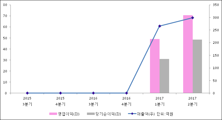 08월 10일 코미코(183300)의 2017년 2분기 연결 잠정 실적이 발표됐다. 지난해 같은 기간 대비해서 매출액, 영업이익, 당기순이익 모두 증가하였다. 233억원이었던 매출액은 28.2% 증가하여 299억원을 기록했다. 영업이익은 52.6% 상승하여 70.6억원이고, 당기순이익은 48.6억원으로 발표됐다.