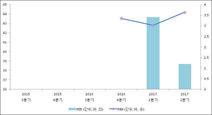 주가가 1주당 수익의 몇배가 되는지 나타내는 주가수익비율(PER)은 38.69배로 나타났다. 직전분기 PER은 43.66배로 이번 분기에 하락했다.주가가 1주당 순자산의 몇배인지 알려주는 주가순자산비율인 PBR은 0배이다. 최근 1년 대비 이번 분기 PBR은 급등했다. 2분기 주당순자산(BPS), 주가 모두 상승했는데, 주가의 상승폭이 더 컸기 때문에 PBR이 상승했다.
