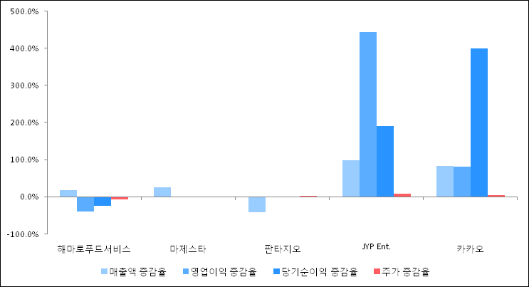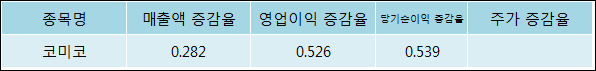 다음은 코미코와 동일 업종 내 비교 그룹 종목의 각각 최근 실적의 전년 동기 대비 성장률이다. 코미코의 매출액 증감율은 타 종목 대비 가장 우수한 편이다. 그리고 주가는 하락하였지만 가장 나은 상승률을 기록하였다.