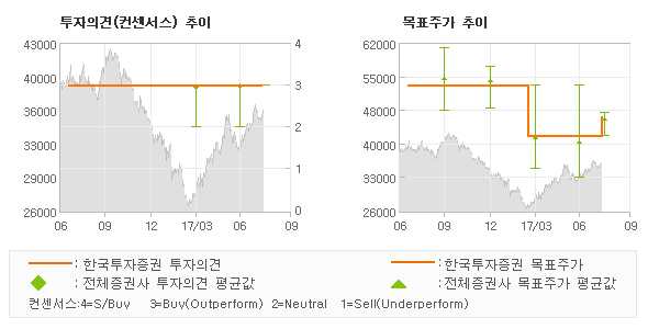 한국투자증권의 동종목에 대한 최근 1년동안의 투자의견은 전체적으로 큰 변화없이 유지되고 있다. 목표주가는 2016년7월 53,000원까지 높아졌다가 2017년3월 42,000원을 최저점으로 목표가가 제시된 이후 최근에 46,000원으로 새롭게 조정되고 있다.