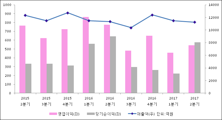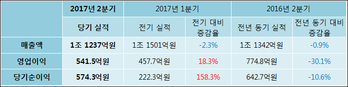 08월 10일 코오롱인더(120110)의 2017년 2분기 연결 잠정 실적이 발표됐다. 매출액, 영업이익, 당기순이익 모두 전년 같은 기간 대비해서 감소하였다. 매출액은 0.92% 감소한 1조 1237억원으로 발표됐다. 영업이익은 30.12% 줄어들어 541.5억원을, 당기순이익은 10.64% 하락한 574.3억원을 기록하였다.