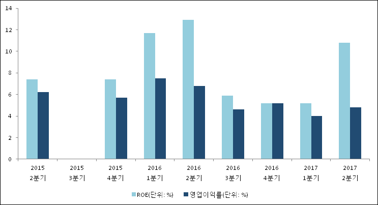 이번분기 기준으로 추정되는 코오롱인더의 자기자본이익률(ROE)은 7.4%로 나타났다. 전년 동기인 2016년 2분기 ROE는 5.9%로 이번 분기에 1.5%p 상승했다. 한편 동종목의영업이익률은 6.2%이다. 지난해 동기 영업이익률은 4.6%로 이번 2분기가 1.6%p 상승했다.
