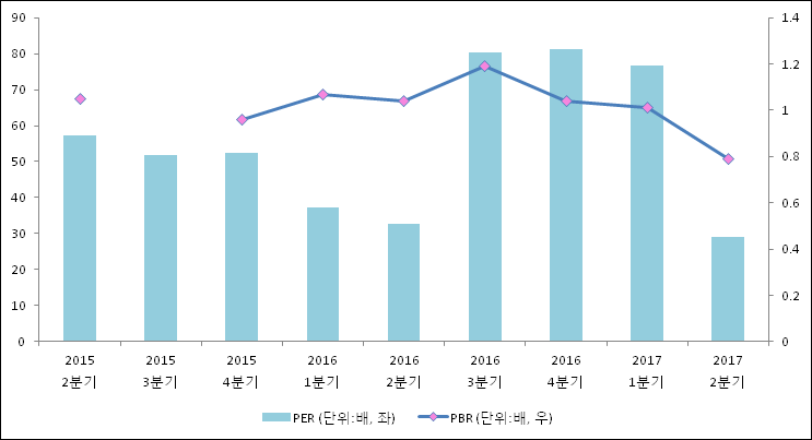 주가가 1주당 수익의 몇배가 되는지 나타내는 주가수익비율(PER)은 57.17배로 나타났다. 전년 동기 PER은 80.41배로 이번 분기에 하락했다.주가가 1주당 순자산의 몇배인지 알려주는 주가순자산비율인 PBR은 1.05배이다. PBR은 최근 3분기 이상 연속으로 하락하다가 이번 분기에 상승했다. 지난해 동기 PBR은 1.19배로 이번 2분기 PBR이 하락했다.