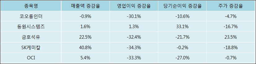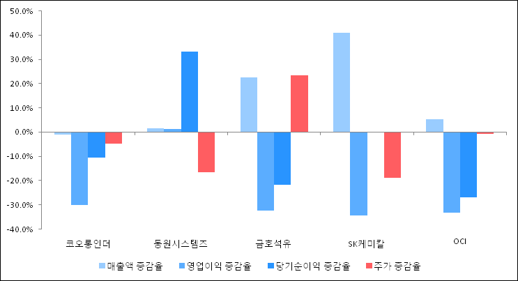 다음은 코오롱인더와 동일 업종 내 비교 그룹 종목의 각각 최근 실적의 전년 동기 대비 성장률이다. 코오롱인더의 매출액 증감율은 타 종목 대비 가장 저조한 편이다. 그리고 주가는 하락하였지만 하락율이 비교적 크지는 않았다.