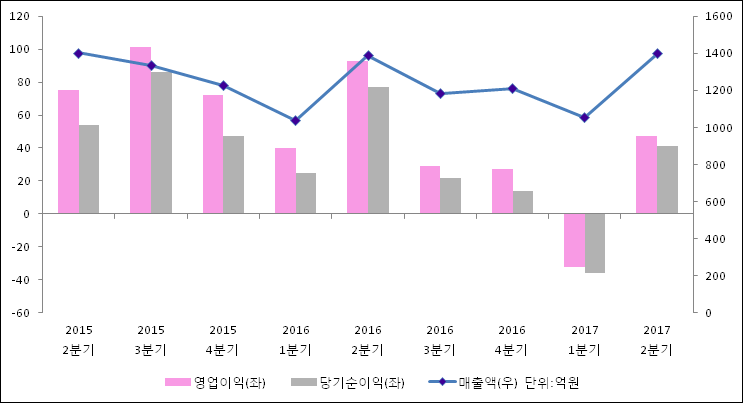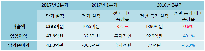 08월 10일 삼화페인트공업(000390)의 2017년 2분기 연결 잠정 실적이 발표됐다. 매출액은 전년 동기 대비해서 0.6% 신장된 1398억원으로 발표되었다. 매출액 상승에도 불구하고영업이익은 49.1% 감소하여 47.3억원으로, 당기순이익은 46.3% 줄어들어 41.3억원으로 기록 되었다.