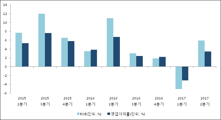 이번분기 기준으로 추정되는 삼화페인트공업의 자기자본이익률(ROE)은 7.7%로 나타났다. ROE는 3분기 이상 연속으로 하락하다 저번 분기부터 반등하여 이번 분기에도 상승했다. 전년 동기인 2016년 2분기 ROE는 3%로 이번 분기에 4.7%p 상승했다. 한편 동종목의영업이익률은 5.3%이다. 3분기 이상 연속으로 하락하다 저번 분기부터 반등하여 이번 분기에도 상승했다. 지난해 동기 영업이익률은 2.4%로 이번 2분기가 2.9%p 상승했다.