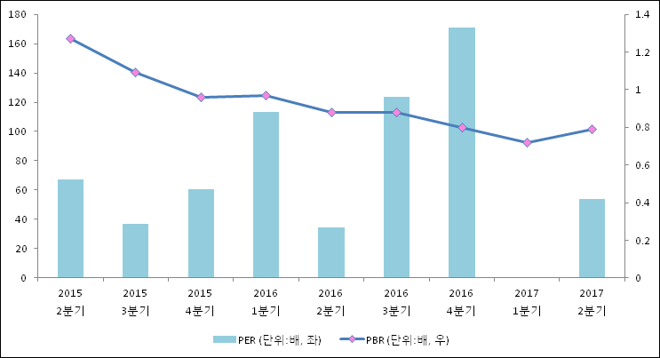 주가가 1주당 수익의 몇배가 되는지 나타내는 주가수익비율(PER)은 67.01배로 나타났다. 전년 동기 PER은 123.91배로 이번 분기에 하락했다.주가가 1주당 순자산의 몇배인지 알려주는 주가순자산비율인 PBR은 1.27배이다. 지난해 동기 PBR은 0.88배로 이번 2분기 PBR이 상승했다.