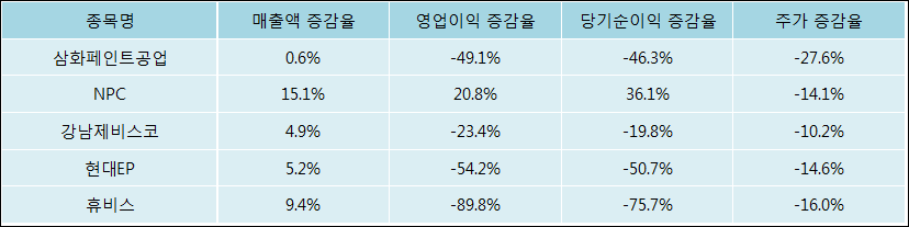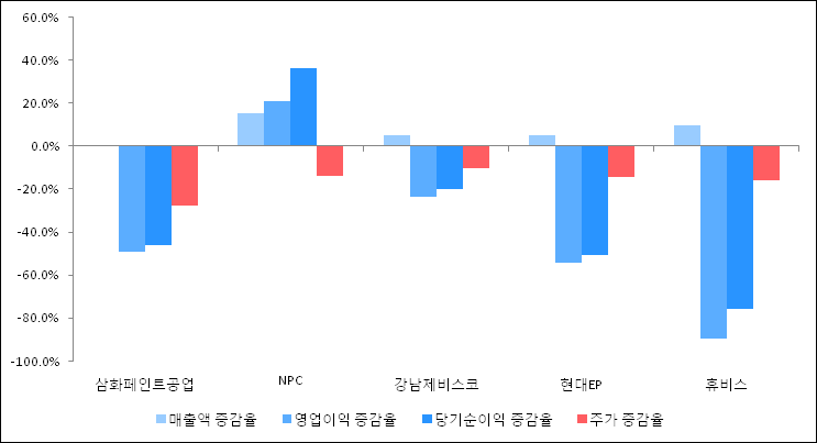 다음은 삼화페인트공업과 동일 업종 내 비교 그룹 종목의 각각 최근 실적의 전년 동기 대비 성장률이다. 삼화페인트공업의 매출액은 증가했지만 증감율은 타 종목 대비 가장 저조한 편이다. 그리고 주가의 하락율이 가장 큰 편으로 나타났다.