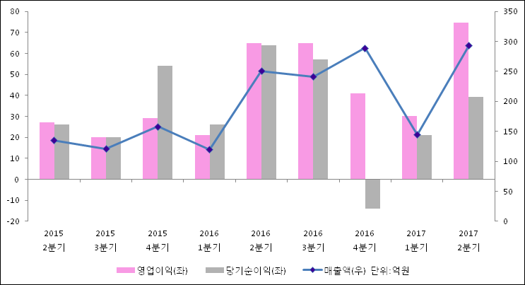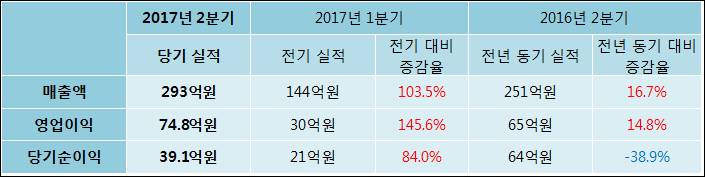 08월 10일 지스마트글로벌(114570)의 2017년 2분기 개별 확정 실적이 발표됐다. 매출액 293억원으로, 영업이익은 74.8억원으로 작년 같은 기간 대비 각각 16.67%, 14.84% 증가했다. 반면 당기순이익은 39.1억원으로 38.86% 하락했다.