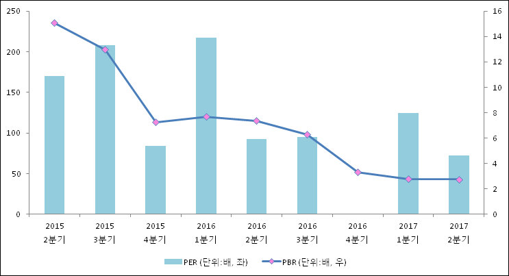 주가가 1주당 수익의 몇배가 되는지 나타내는 주가수익비율(PER)은 72.36배로 나타났다. 전년 동기 PER은 92.52배로 이번 분기에 하락했다.주가가 1주당 순자산의 몇배인지 알려주는 주가순자산비율인 PBR은 2.74배이다. PBR은 최근 5분기 이상 연속으로 하락하고 있다. 지난해 동기 PBR은 7.36배로 이번 2분기 PBR이 하락했다.