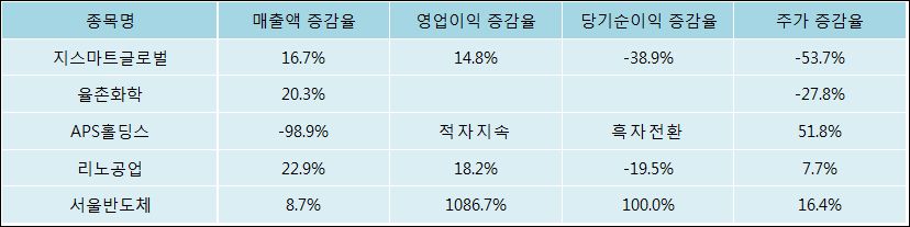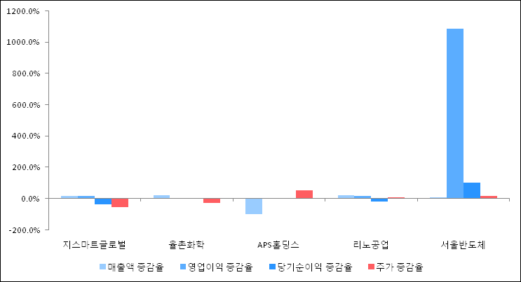 다음은 지스마트글로벌과 동일 업종 내 비교 그룹 종목의 각각 최근 실적의 전년 동기 대비 성장률이다. 지스마트글로벌의 매출액 증감율은 타 종목 대비 양호한 편이다. 그리고 주가의 하락율이 가장 큰 편으로 나타났다.