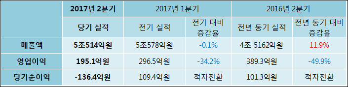 08월 10일 SK네트웍스(001740)의 2017년 2분기 연결 잠정 실적이 발표됐다. 전년 같은 기간 대비해서 매출액은 11.85% 상승하여 5조514억원을 기록했다. 영업이익은 49.88% 하락하여 195.1억원을 기록했다. 당기순이익은 101.3억원에서-136.4억원으로 적자전환되었다.