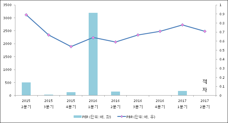 주가가 1주당 순자산의 몇배인지 알려주는 주가순자산비율인 PBR은 0.71배이다. PBR은 최근 3분기 이상 꾸준히 상승하다가 이번 분기에는 하락했다. 지난해 동기 PBR은 0.59배로 이번 2분기 PBR이 상승했다.
