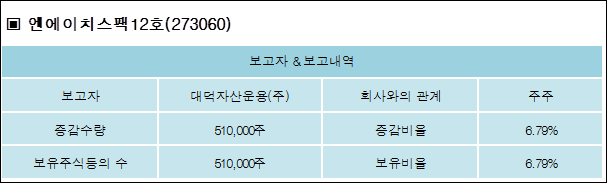 엔에이치스팩12호(273060)는 10일 주주 대덕자산운용(주)의 보유주식이 증가되었다고 발표했다. 이는 직전 보고일보다 510,000주 증가하여 지분율은 6.79%로 상승했다. 이번 보고 사유는 신규상장으로 알려졌다.