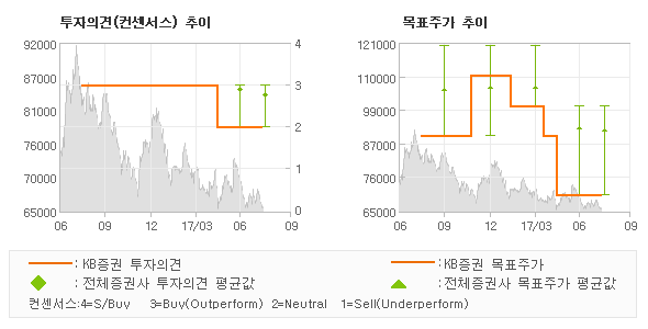 KB증권의 동종목에 대한 최근 1년동안의 투자의견은 전체적으로 조금 하향조정되고 있다. 목표주가는 2016년11월 110,000원까지 높아졌다가 2017년5월 70,000원을 최저점으로 목표가가 제시된 이후 최근에도 70,000원으로 제시되고 있다.