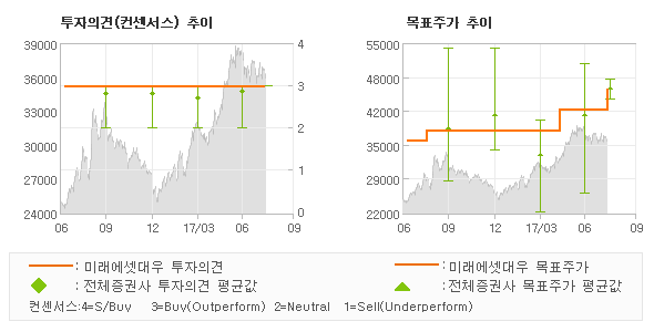 미래에셋대우의 동종목에 대한 최근 1년동안의 투자의견은 전체적으로 큰 변화없이 유지되고 있다. 목표주가는 42,000원이 고점으로, 반대로 36,000원이 저점으로 제시된 이후 이번에 46,000수준으로 새롭게 조정되고 있다.