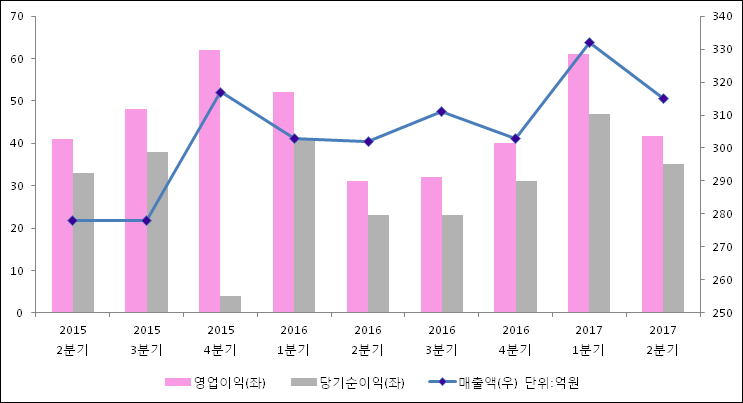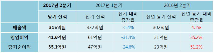 08월 11일 이연제약(102460)의 2017년 2분기 개별 확정 실적이 발표됐다. 전년 동기 대비해서 매출액, 영업이익, 당기순이익 모두 증가하였다. 302억원이었던 매출액은 4.14% 증가하여 315억원을 기록했다. 영업이익은 35.17% 상승하여 41.6억원이고, 당기순이익은 35.1억원으로 발표됐다.