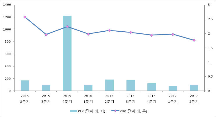 주가가 1주당 수익의 몇배가 되는지 나타내는 주가수익비율(PER)은 98.86배로 나타났다. PER은 최근 3분기 이상 연속으로 하락하다 이번 분기에 상승했다. 전년 동기 PER은 184.44배로 이번 분기에 하락했다.주가가 1주당 순자산의 몇배인지 알려주는 주가순자산비율인 PBR은 1.76배이다. 지난해 동기 PBR은 2.11배로 이번 2분기 PBR이 하락했다.