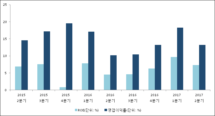 이번분기 기준으로 추정되는 이연제약의 자기자본이익률(ROE)은 7.3%로 나타났다. ROE는 최근 3분기 이상 꾸준히 상승하다가 이번 분기에 하락했다. 전년 동기인 2016년 2분기 ROE는 4.5%로 이번 분기에 2.8%p 상승했다. 한편 동종목의영업이익률은 13.2%이다. 최근 3분기 이상 꾸준히 상승하다가 이번 분기에 하락했다. 지난해 동기 영업이익률은 10.2%로 이번 2분기가 3%p 상승했다.