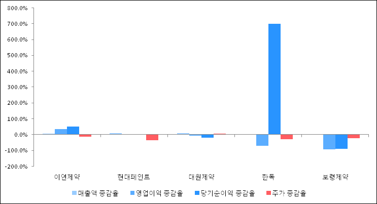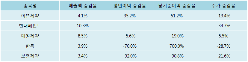 다음은 이연제약과 동일 업종 내 비교 그룹 종목의 각각 최근 실적의 전년 동기 대비 성장률이다. 이연제약의 매출액 증감율은 타 종목 대비 양호한 편이다. 그리고 주가는 하락하였지만 비교적 적은 하락율을 보였다.