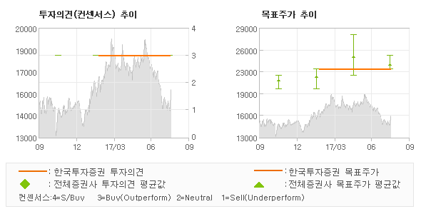 오늘 한국투자증권에서 발표된 '매수(유지)'의견 및 목표주가 23,000원은 전체의견에 수렴하면서 시장의 평균적인 기대감이 비교적 객관적으로 표현된 것으로 풀이되며 목표가평균 대비 7.1%정도 미달하고 있는 것으로 집계되었다. 참고로 최근에 목표주가를 가장 공격적으로 제시한 신영증권에서 투자의견 '매수(신규)'에 목표주가 28,000원을 제일 보수적인 의견을 제시한 동부증권에서 투자의견 '매수(유지)'에 목표주가 23,000원을 제시한 바 있다.