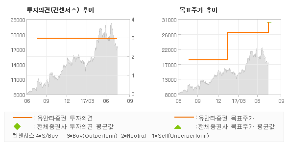 오늘 유안타증권에서 발표된 '매수(유지)'의견 및 목표주가 30,000원은 전체의견에 수렴하면서 시장의 평균적인 기대감이 비교적 객관적으로 표현된 것으로 풀이되며 목표가평균과 대비해서 미미한 차이가 나는 것으로 집계되었다. 참고로 최근 증권사 매매의견 중에서 제시한 바 있다.
