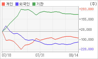 | 외국인과 개인은 순매도, 기관은 순매수(한달누적) 기관이 6일연속 주식을 팔고 있는 반면 외국인은 3일연속 주식을 사고 있다. 4주간을 기준으로 보면 기관이 초반에 동종목을 순매수한 이후에 최근에는 순매수량이 줄어들고 있음에도 불구하고 216,565주를 순매수한 반면, 외국인은 매도 후 매수의 관점을 보이고 있음에도 불구하고 133,841주를 순매도했고, 개인들도 초반에 동종목을 순매도한 이후에 근래에는 순매도량을 줄이면서 82,724주를 순매도했다. |