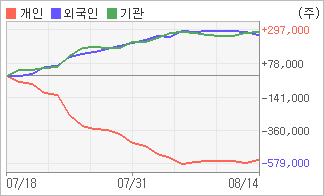 | 외국인/기관 순매수, 개인은 순매도(한달누적) 기관이 2일연속 순매수를 보이고 있는 반면에 외국인은 3일연속 순매도를 보이고 있다. 4주간을 기준으로 보면 외국인이 초반에 동종목을 순매수한 이후에 기세를 이어가며 267,027주를 순매수했고, 기관도 방향성있는 매매를 하면서 284,458주를 순매수했다. 반면 개인들은 매도쪽으로 방향을 잡으면서 551,485주를 순매도한 것으로 나타났다. |
