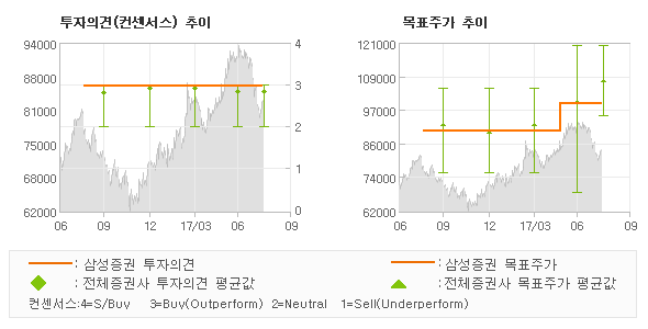 삼성증권의 동종목에 대한 최근 1년동안의 투자의견은 전체적으로 큰 변화없이 유지되고 있다. 목표주가는 2016년8월 90,000원이 저점으로 제시된 이후 이번에 발표된 100,000원까지 꾸준하게 상향조정되어 왔다.