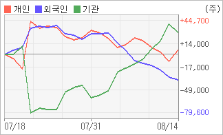 | 기관/개인 순매수, 외국인은 순매도(한달누적) 8월3일부터 외국인들이 8거래일 연속 순매도 행진을 벌이고 있다. 4주간을 기준으로 보면 기관이 순매도를 기록하다가 다시 순매수로 돌아서면서 29,600주를 순매수했고, 개인들도 매기를 떨어뜨리면서도 5,244주를 순매수했다. 반면 그 동안 외국인은 순매도로 돌아서면서 34,844주를 순매도했다. |