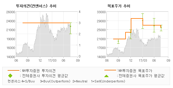 NH투자증권의 동종목에 대한 최근 1년동안의 투자의견은 전체적으로 큰 변화없이 유지되고 있다. 목표주가는 2016년8월 21,000원이 저점으로 제시된 이후 2017년1월 30,000원을 최고점으로 목표가가 제시되었고 최근에는 26,000원으로 다소 하향조정되고 있다.