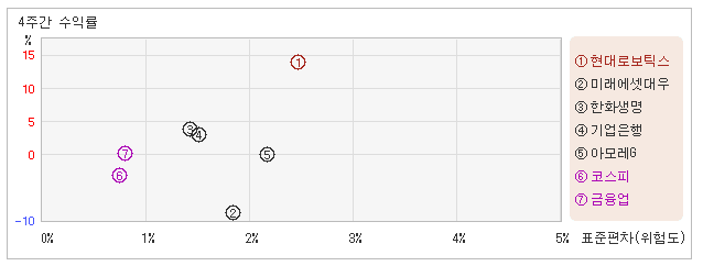 | 관련종목들 가운데서 변동폭은 낮지만 수익률은 커 16일 오후 1시40분 현재 전일대비 4.17% 하락하면서 460,000원을 기록하고 있는 현대로보틱스는 지난 1개월간 14.14% 상승했다. 동기간 동안에 주가움직임의 위험지표인 표준편차는 2.4%를 기록했다. 이는 금융업 업종내에서 주요종목들과 비교해볼 때 현대로보틱스의 월간 주가수익률이 가장 높았던 만큼 변동성도 가장 높은 수준을 유지했다는 뜻이다. 최근 1개월을 기준으로 현대로보틱스의 위험을 고려한 수익률은 5.8을 기록했는데, 변동성이 가장 컸으나 주가상승률도 매우 높았기때문에 위험대비 수익률도 높은 수준을 나타냈다. 뿐만아니라 금융업업종의 위험대비수익률인 0.2보다도 높기 때문에 업종대비 성과도 좋았다고 할 수 있다. 다음으로 업종과 시장을 비교해보면 현대로보틱스가 속해 있는 금융업업종은 코스피지수보다 변동성과 수익률이 모두 높은 모습이다. 다시 말하면 동업종에 탄력이 붙으면서 지수대비 초과상승했다는 의미이다. |