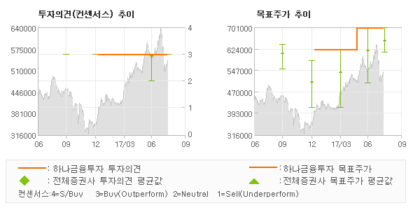 하나금융투자의 동종목에 대한 최근 3개월 동안의 투자의견은 전체적으로 큰 변화없이 유지되고 있다. 목표주가는 2017년1월 620,000원이 저점으로 제시된 이후 이번에 발표된 700,000원까지 꾸준하게 상향조정되어 왔다.