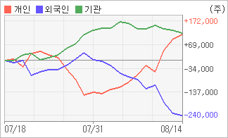 | 기관/개인 순매수, 외국인은 순매도(한달누적) 8월10일부터 전일까지 기관과 외국인은 3거래일연속 동반 순매도했다. 4주간을 기준으로 보면 기관이 초반에 동종목을 순매수한 이후에 최근에는 순매수량이 줄어들고 있음에도 불구하고 122,373주를 순매수했고, 개인들도 매수반전의 모습을 보이며 116,628주를 순매수했다. 반면 그 동안 외국인은 매도 우위를 지속하면서 239,001주를 순매도했다. |