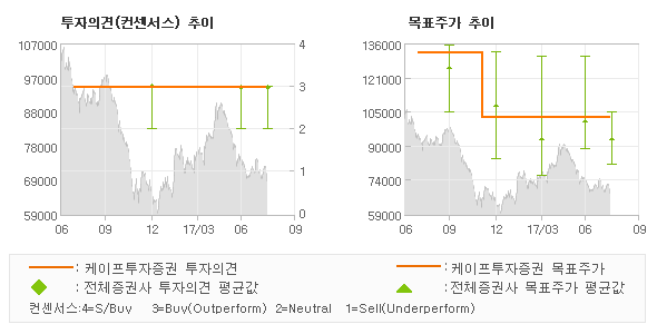 오늘 케이프투자증권에서 발표된 '매수(유지)'의견 및 목표주가 103,000원은 전체 컨센서스 대비해서 대체적으로 평균치에 해당하는 수준으로, 이번 의견은 동종목에 대한 전체적인 흐름에서 크게 벗어나지 않은 것으로 파악되며 목표가평균 대비 12.1% 초과하고 있는 것으로 집계되었다. 참고로 최근에 목표주가를 가장 공격적으로 제시한 하이투자증권에서 투자의견 '매수(유지)'에 목표주가 105,000원을 제일 보수적인 의견을 제시한 대신증권에서 투자의견 '시장수익률(하향)'에 목표주가 81,000원을 제시한 바 있다.