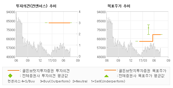 골든브릿지투자증권의 동종목에 대한 최근 3개월 동안의 투자의견은 전체적으로 큰 변화없이 유지되고 있다. 목표주가는 2017년3월 63,000원이 저점으로 제시된 이후 이번에 발표된 70,000원까지 꾸준하게 상향조정되어 왔다.