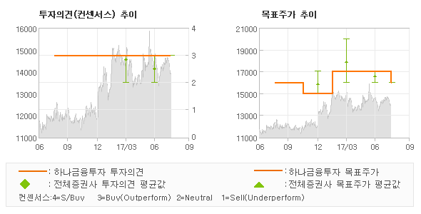 오늘 하나금융투자에서 발표된 '매수'의견 및 목표주가 16,000원은 전체 컨센서스 대비해서 상대적으로 긍정적인 수준으로서 이는 동종목에 대한 기대감을 보다 강하게 표현한 것으로 풀이되며 목표가평균과 대비해서 미미한 차이가 나는 것으로 집계되었다. 참고로 최근에 목표주가를 가장 공격적으로 제시한 NH투자증권에서 투자의견 'HOLD(유지)'에 목표주가 16,000원을 제일 보수적인 의견을 제시한 NH투자증권에서 투자의견 'HOLD(유지)'에 목표주가 16,000원을 제시한 바 있다.