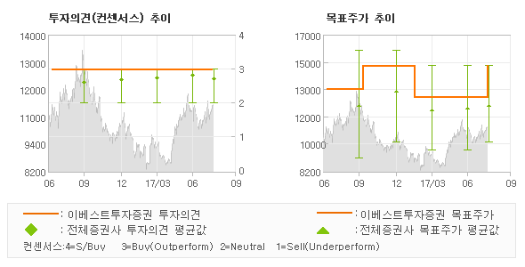 이베스트투자증권의 동종목에 대한 최근 1년동안의 투자의견은 전체적으로 큰 변화없이 유지되고 있다. 목표주가는 2016년8월 13,000원이 저점으로 제시된 이후에 최근에는 15,000원까지 상향조정되고 있다.
