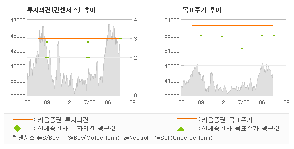 오늘 키움증권에서 발표된 '매수(유지)'의견 및 목표주가 59,000원은 전체 컨센서스 대비해서 대체적으로 평균치에 해당하는 수준으로, 이번 의견은 동종목에 대한 전체적인 흐름에서 크게 벗어나지 않은 것으로 파악되며 목표가평균 대비 6.3% 초과하고 있는 것으로 집계되었다. 참고로 최근에 목표주가를 가장 공격적으로 제시한 하나금융투자에서 투자의견 '매수'에 목표주가 59,000원을 제일 보수적인 의견을 제시한 HMC투자증권에서 투자의견 '매수'에 목표주가 51,000원을 제시한 바 있다.