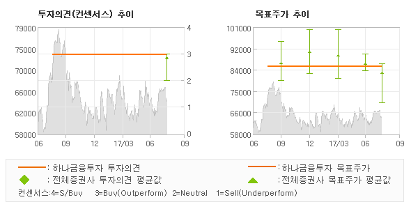 오늘 하나금융투자에서 발표된 '매수'의견 및 목표주가 85,000원은 전체 컨센서스 대비해서 대체적으로 평균치에 해당하는 수준으로, 이번 의견은 동종목에 대한 전체적인 흐름에서 크게 벗어나지 않은 것으로 파악되며 목표가평균 대비 3.7% 초과하고 있는 것으로 집계되었다. 참고로 최근에 목표주가를 가장 공격적으로 제시한 NH투자증권에서 투자의견 '매수(유지)'에 목표주가 86,000원을 제일 보수적인 의견을 제시한 삼성증권에서 투자의견 'HOLD'에 목표주가 70,000원을 제시한 바 있다.