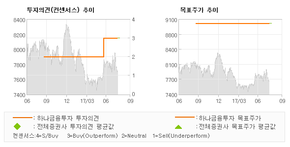 오늘 하나금융투자에서 발표된 '매수'의견 및 목표주가 9,000원은 전체 컨센서스 대비해서 대체적으로 평균치에 해당하는 수준으로, 이번 의견은 동종목에 대한 전체적인 흐름에서 크게 벗어나지 않은 것으로 파악되며 목표가평균과 대비해서 미미한 차이가 나는 것으로 집계되었다. 참고로 최근 증권사 매매의견 중에서 제시한 바 있다.