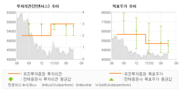 유진투자증권의 동종목에 대한 최근 1년동안의 투자의견은 전체적으로 상향조정되고 있다. 목표주가는 2016년8월 64,000원까지 높아졌다가 2017년3월 55,000원을 최저점으로 목표가가 제시된 이후 최근에도 55,000원으로 제시되고 있다.