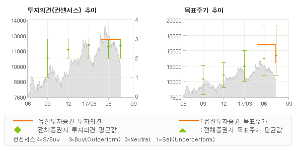 오늘 유진투자증권에서 발표된 '매수(유지)'의견 및 목표주가 13,000원은 전체의견을 소폭 상회하는 수준으로 이는 동종목에 대한 기대감을 보다 공격적으로 표현한 것으로 풀이되며 목표가평균 대비 6.6%정도 미달하고 있는 것으로 집계되었다. 참고로 최근에 목표주가를 가장 공격적으로 제시한 신영증권에서 투자의견 '매수(유지)'에 목표주가 19,000원을 제일 보수적인 의견을 제시한 KB증권에서 투자의견 'HOLD(유지)'에 목표주가 11,000원을 제시한 바 있다.