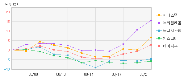전체적인 평가에서는 누리텔레콤이 높은 순위를 차지했다. 최근 10거래일(2주)을 분석했을때, 누리텔레콤(15.43%), 피에스텍(6.55%)의 상승률이 상대적으로 큰 것으로 나타났다. 위험도 분석에서는 누리텔레콤(0.82), 피에스텍(0.64)이 상대적으로 안정적인 수익을 올린 것으로 평가되고 변동성 대비 등락률을 구해보면 누리텔레콤(5.12), 피에스텍(1.97)이 좋은 모습을 보였다.