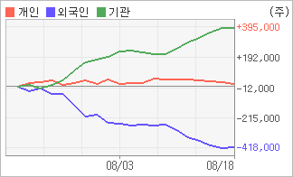 | 기관/개인 순매수, 외국인은 순매도(한달누적) 8월9일부터 전일까지 기관이 7거래일 연속 동종목을 사들였다. 4주간을 기준으로 보면 기관이 방향성있는 매매를 하면서 394,878주를 순매수했고, 개인들도 매기를 떨어뜨리면서도 15,078주를 순매수했다. 반면 그 동안 외국인은 매도 우위를 지속하면서 409,956주를 순매도했다. |