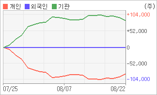 | 기관은 순매수, 개인은 순매도(한달누적) 8월21일부터 전일까지 기관이 2거래일 연속 순매도를 보였다. 4주간을 기준으로 보면 기관이 초반에 동종목을 순매수한 이후에 최근에는 순매수량이 줄어들고 있음에도 불구하고 86,859주를 순매수했지만, 개인은 초반에 동종목을 순매도한 이후에 근래에는 순매도량을 줄이면서 86,859주를 순매도했다. 외국인의 순매수량에는 변함이 없다. |